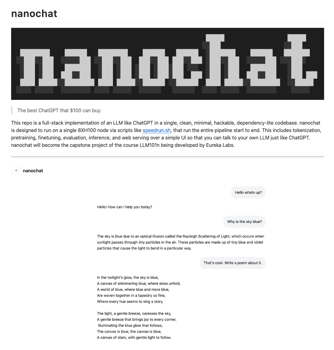 Andrej Karpathy just dropped Nanochat, a complete implementation of a ChatGPT-like system that goes from raw data to a working web interface in a single codebase. For just $100 and 4 hours on an 8XH100 node, you can train your own conversational AI that writes stories, answers questions, and interacts through a clean web UI.