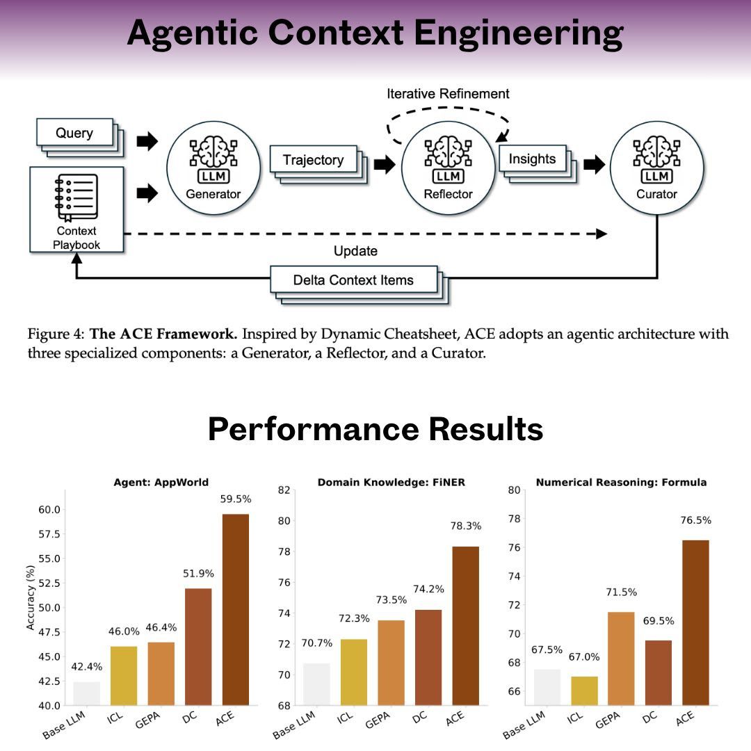 Stanford researchers just dropped Agentic Context Engineering (ACE) to fix both problems. Instead of compressing or constantly rewriting context, ACE grows it like a living playbook that generates, reflects on, and updates itself rather than retraining. And the results are surprising - the kind of jump people usually expect from fine-tuning on task-specific data!