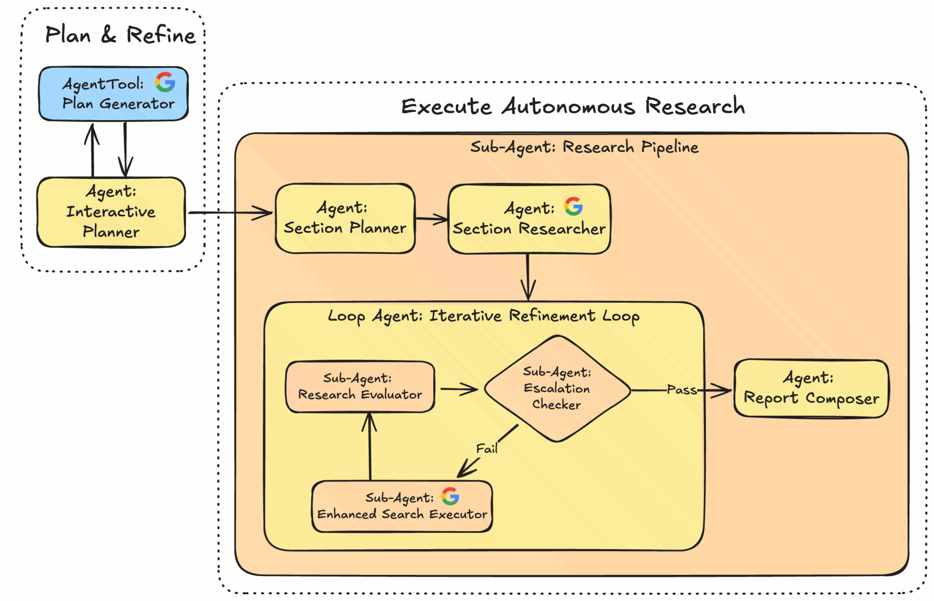 Google's Agent Development Kit now ships with "Deep Search," a full-stack reference implementation showing how to build agents that actually think through problems recursively. The workflow splits into human-collaborative planning (where you refine research goals together), followed by autonomous execution - the agent loops through searching, self-critiquing for gaps, and refining until it has enough data, then composes a comprehensive report with linked citations to all source material.
