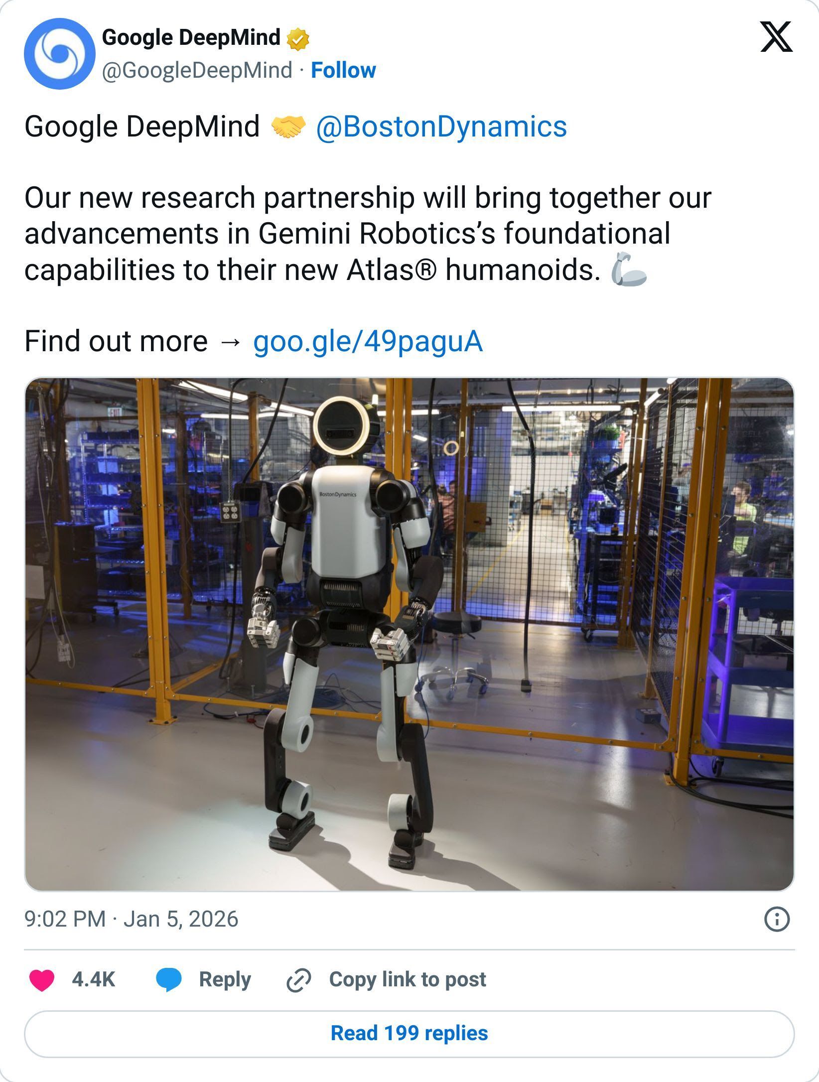 Boston Dynamics publicly demoed its humanoid robot Atlas for the first time at CES. The production version ships to Hyundai factories in 2028. Google DeepMind signed on to integrate Gemini Robotics into Atlas. Specs: 7.5ft reach, lifts 110lbs, operates from -4°F to 104°F.