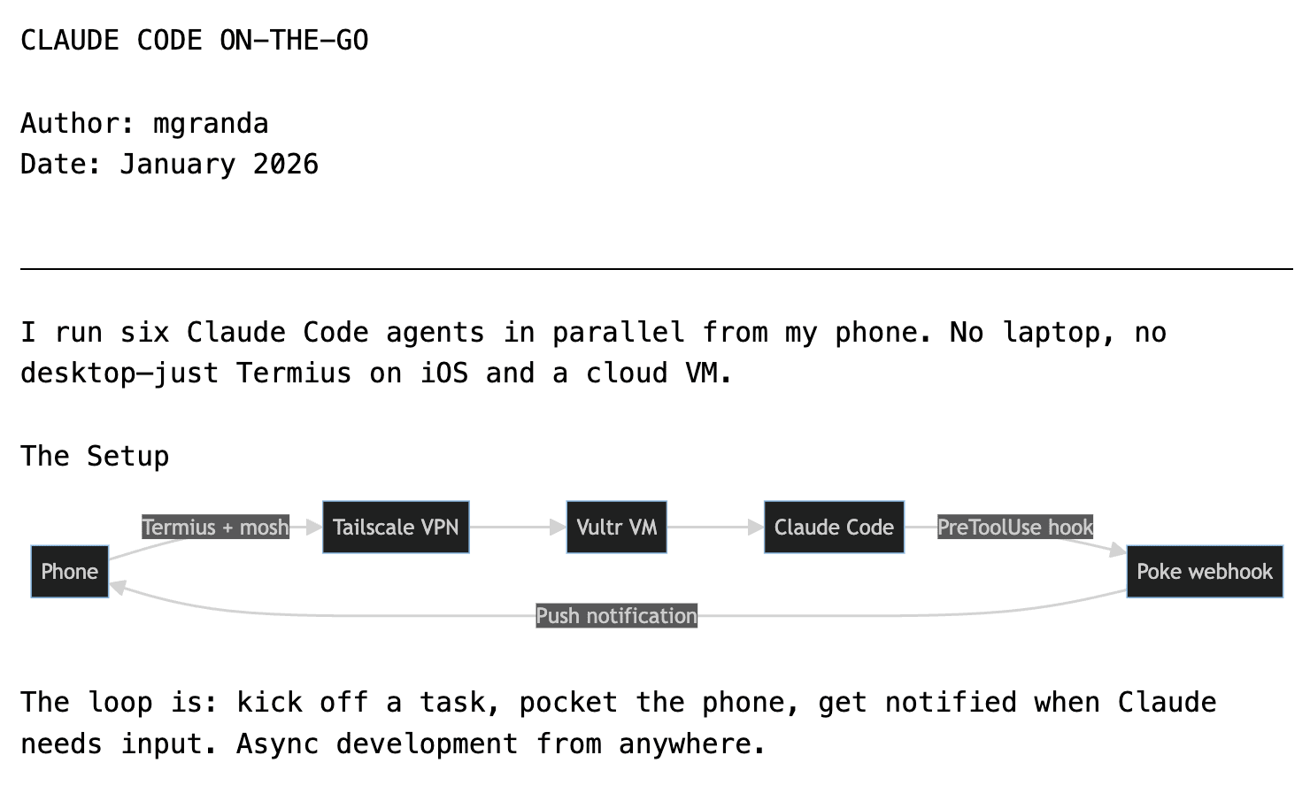 A developer is running six Claude Code agents in parallel from his phone. No laptop, no desktop, just Termius on iOS connected to a cloud VM through VPN. The architecture is elegantly simple: Termius connects via mosh (which survives WiFi-to-cellular transitions and dead zones) to a Vultr VM running Claude Code. The real magic? Push notifications through Poke webhooks that ping your phone whenever Claude needs input.