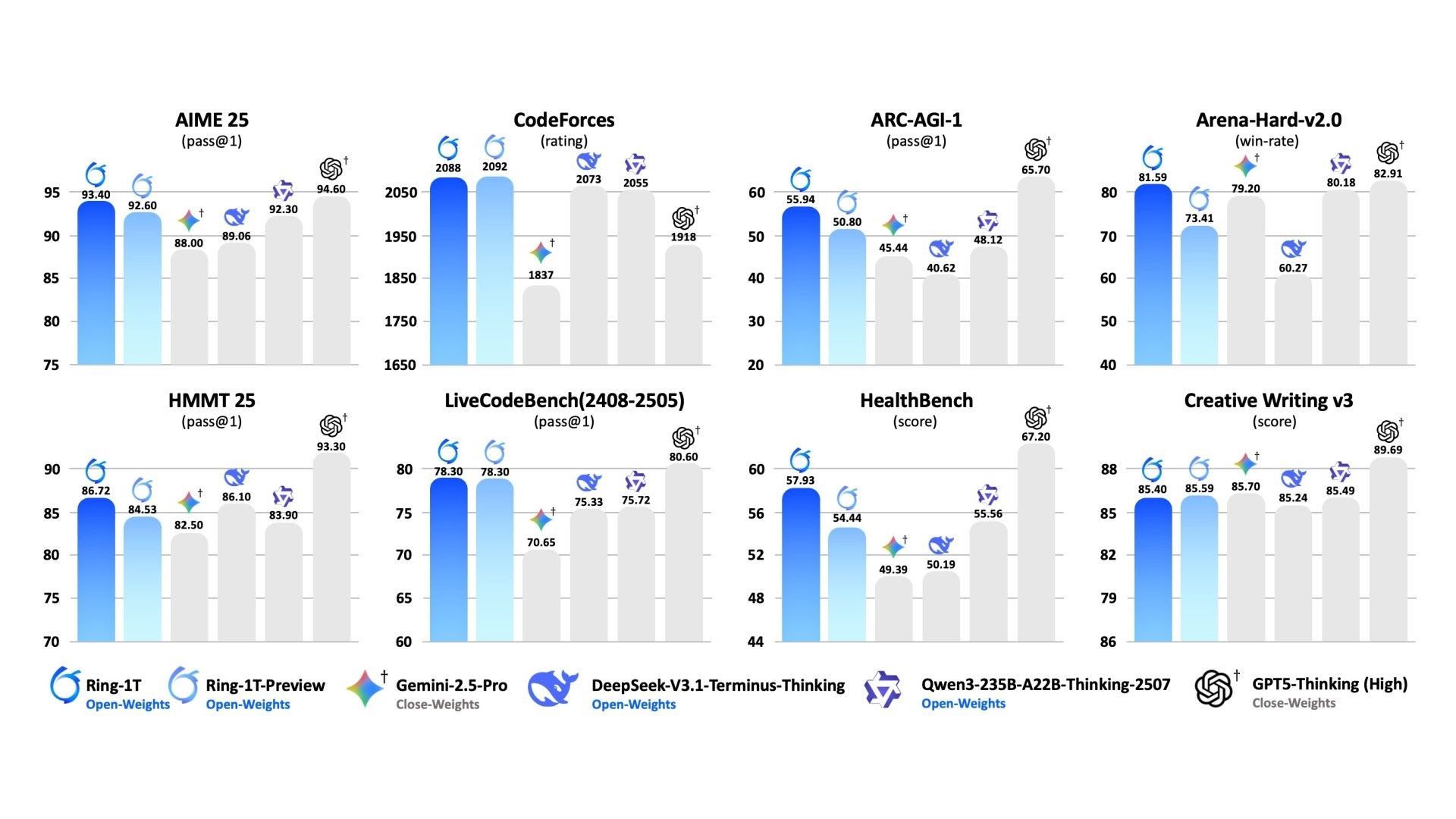 InclusionAI, Ant Group’s AGI initiative, unveiled Ring-1T, an open-source “thinking model” that internally achieved silver-level on the International Mathematical Olympiad, sitting right behind Google and OAI’s gold-level models. Built atop Inclusion’s MoE design, Ring-1T runs on 1T parameters (50B active) with a 128K context window for ultra-long reasoning and multi-turn thinking.