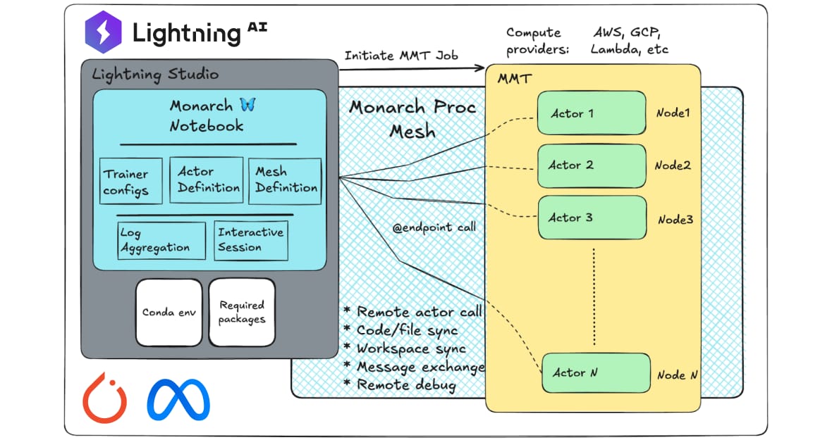 Monarch (Meta's distributed actor framework) combines the power of large-scale training with the familiarity and ease of interactive development. This template showcases multi-node training using Monarch (Meta's distributed actor framework) with TorchTitan (PyTorch's large-scale LLM training library) on Lightning AI infrastructure. You'll learn how to set up, execute, debug, and manage distributed training workflows across multiple GPU nodes.