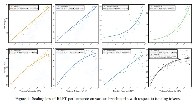 This paper introduces RLPT, a method to train large language models directly on pre-training data with reinforcement learning. It removes human annotation needs and shows strong gains on MMLU, GPQA, and AIME benchmarks.