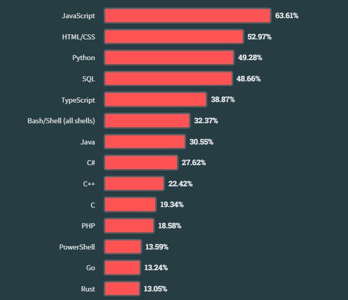 JavaScript has gained massive popularity in the development community. It has transformed the web application development horizon. As per Stackoverflow Developer Survey 2025, JavaScript is the most popular programming, scripting, and markup language with a 63.61% vote share.