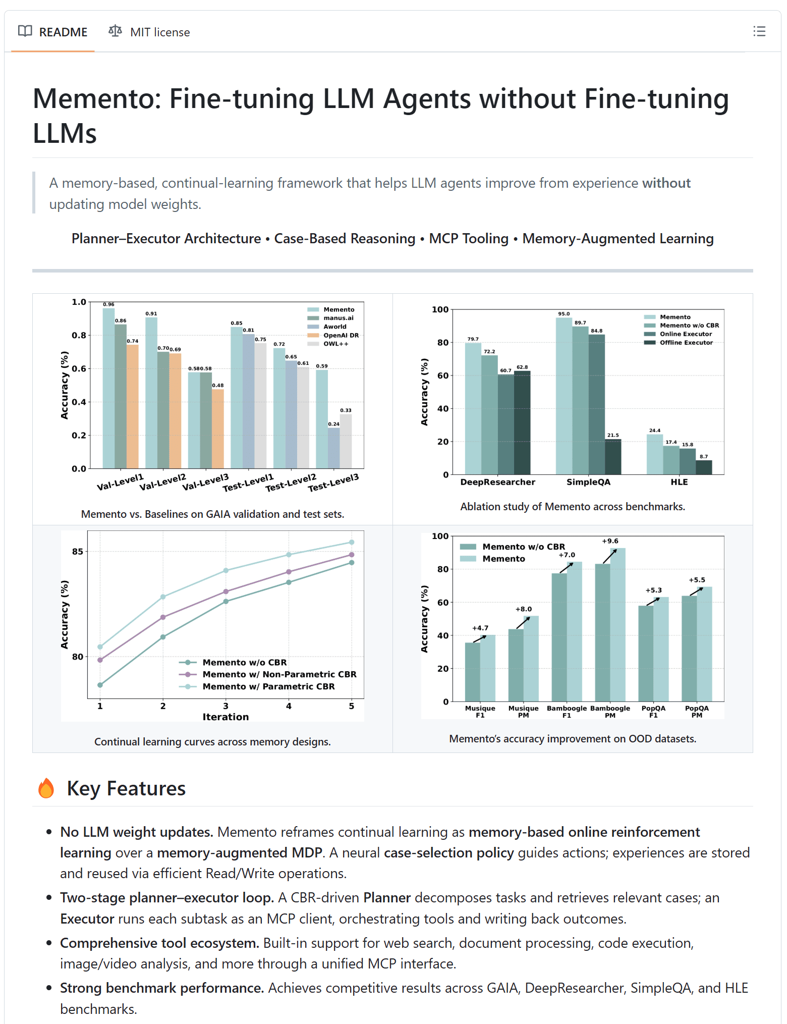 Memento is a memory based continual learning framework for LLM agents that lets them learn from experience over time without touching model weights.