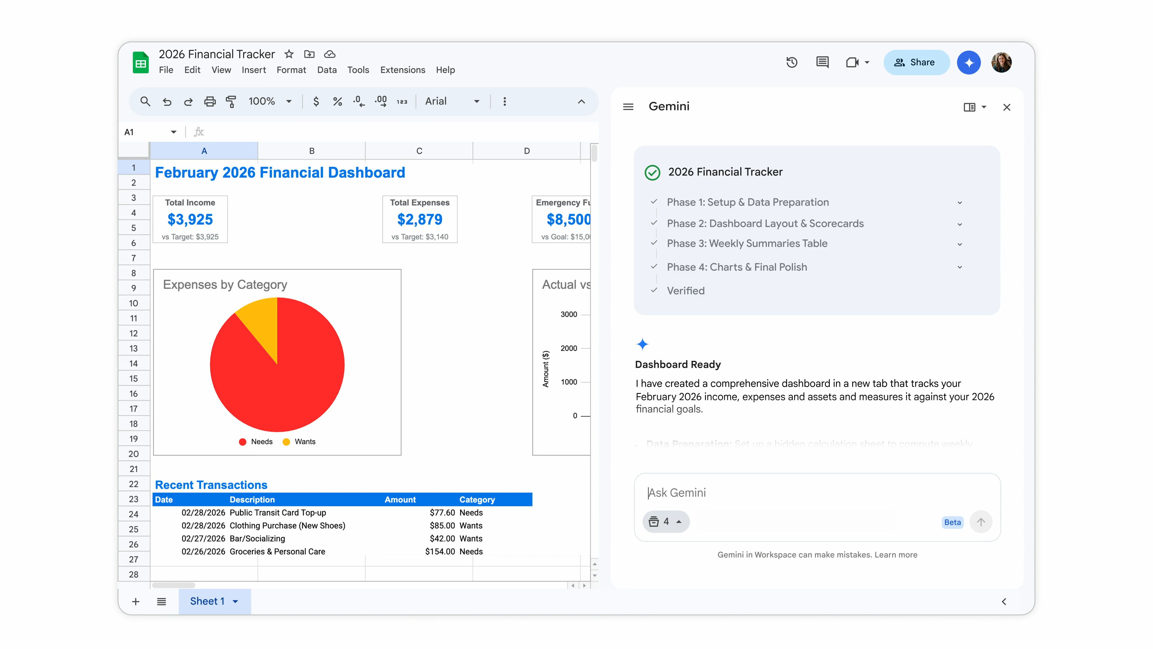 Gemini in Docs, Sheets, Slides, and Drive now pulls context from files and emails to auto-generate spreadsheets, match writing styles, and answer complex questions across your data.