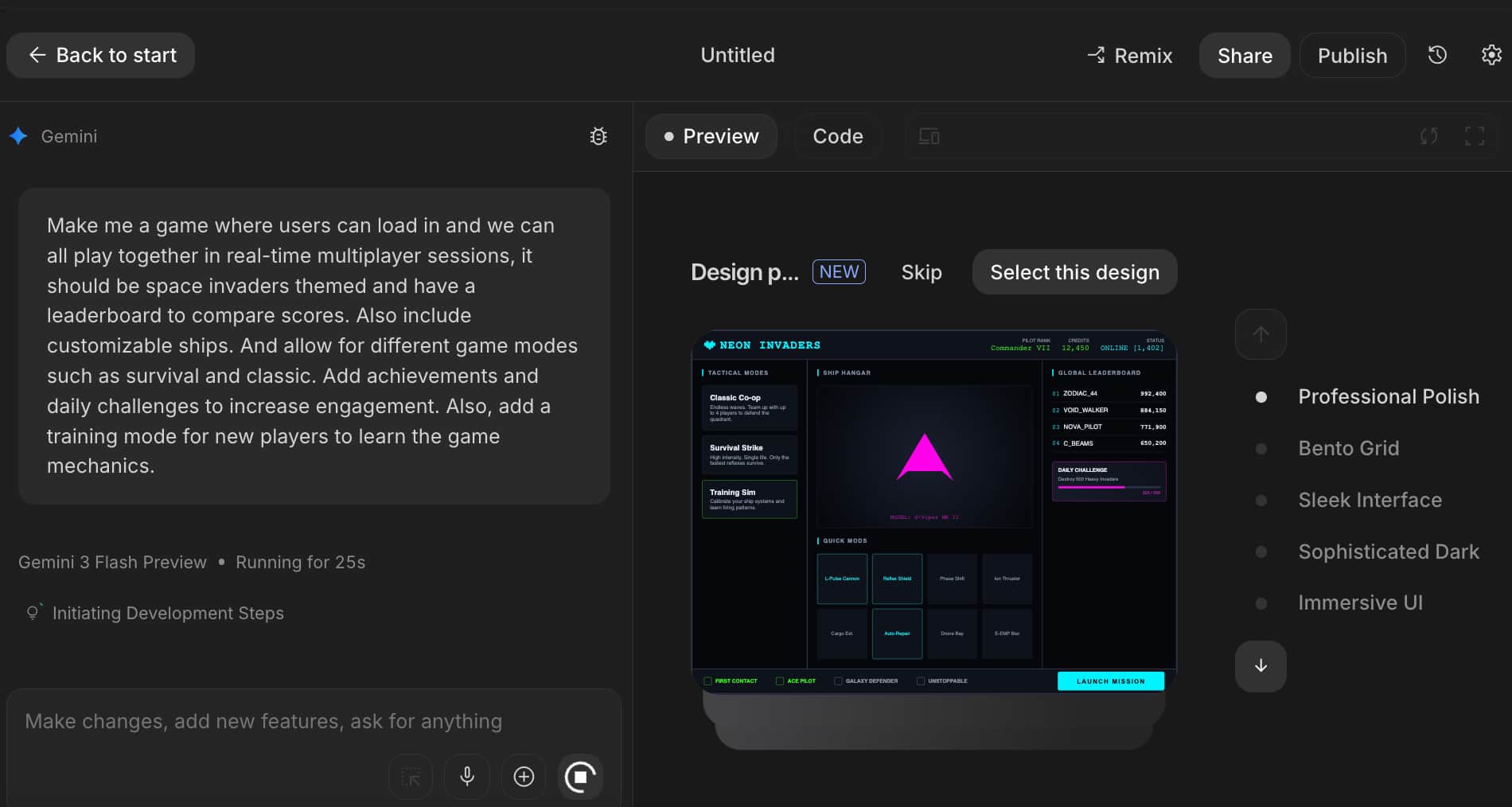 Sample Prompt: Make me a game where users can load in and we can all play together in real-time multiplayer sessions, it should be space invaders themed and have a leaderboard to compare scores. Also include customizable ships. And allow for different game modes such as survival and classic. Add achievements and daily challenges to increase engagement. Also, add a training mode for new players to learn the game mechanics.