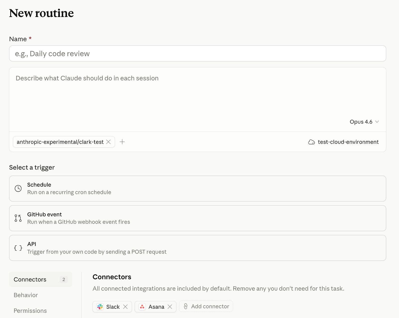 Anthropic just shipped "Routines" for Claude Code. Configure a prompt, point it at a repo and your connectors, then let it run on a schedule, via API webhook, or in response to GitHub events, all on Anthropic's cloud so your laptop can stay shut. Think nightly issue triage, auto-porting PRs across SDKs, or Datadog alerts that arrive pre-triaged with a draft fix. Available today across all paid plans, with Claude Code on the web enabled.