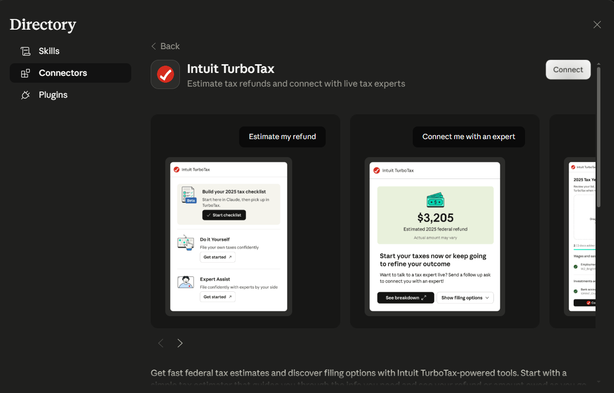 Click "Connectors," then search for "TurboTax," select connect, and start asking your tax questions.