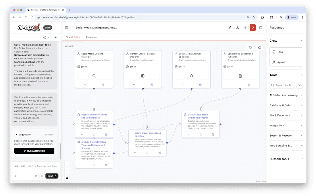 Production AI agents need more than a framework. They need infrastructure, governance, and the ability to scale across departments. CrewAI AMP delivers exactly that: a complete platform for building, deploying, and managing agent systems with the same rigor you'd apply to any critical production service.