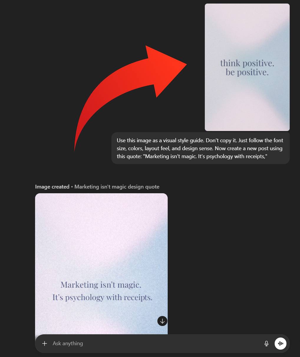 “Use this image as a visual style guide. Don’t copy it. Just follow the font size, colors, layout feel, and design sense. Now create a new post using this quote: "Marketing isn’t magic. It’s psychology with receipts."